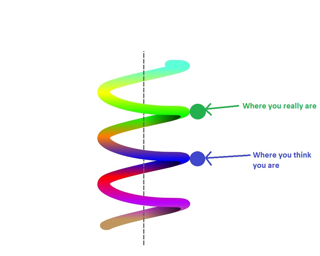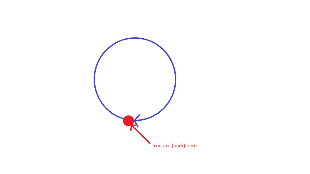 The trick is that our mind would say that we are at the same point, but the truth is that we have ascended in the process and find ourselves at the same point on the horizontal axis, but higher in the vertical dimension.