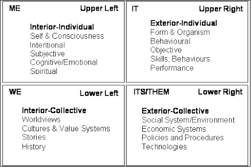 To think about how to design your Default Future, I’d like to bring in a very helpful tool from Integral Theory (read more about this theory and it’s founder here). It’s called the Quadrants tool, and it helps us look at our situation (and reality) from four different perspectives: