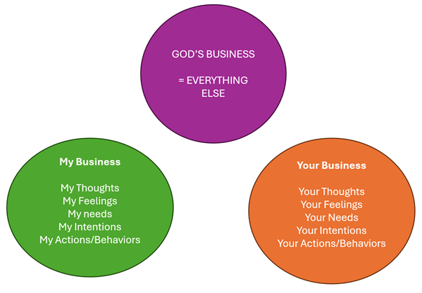 In my circle of responsibility, which is “my business”, I can be aware of and set specific intentions, be aware of my feelings, my needs and my thoughts, as well as engage in actions and behaviors. I can take 100% responsibility for that.